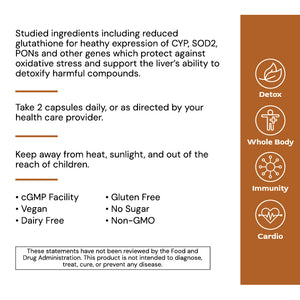 Studied ingredients including reduced glutathione for healthy expression of CYP, SOD2, PONs and other genes which protect against oxidative stress and support the liver’s ability to detoxify harmful compounds.