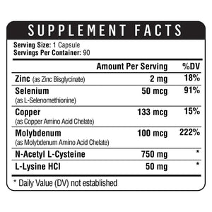 N-acetylcysteine (NAC) has a long and varied history for supporting many different beneficial mechanisms in the body. It’s an amino acid that plays a significant role in optimal detoxification processes, lung health, and immune function. NAC’s unique ability to increase the production of glutathione, help promote a healthy inflammatory response, support the body from toxic insults. NAC is proving useful for its ability to up regulate signaling pathways that boost natural, cellular protections against oxidative stress that promotes cellular senescence. Selenium, L-lysine, molybdenum, zinc, and copper are also included for its synergistic influences especially when used with NAC long-term.
