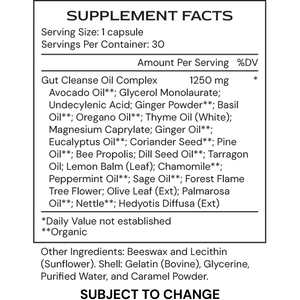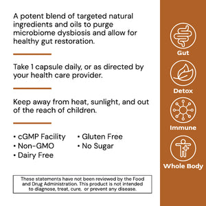 A potent blend of targeted natural ingredients and oils to purge microbiome dysbiosis and allow for healthy gut restoration.