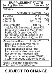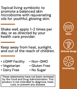 Topical living synbiotic to promote a balanced skin microbiome with rejuvenating oils for youthful, glowing skin.
