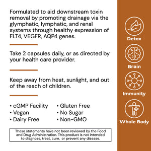 Formulated to aid downstream toxin removal by promoting drainage via the glymphatic, lymphatic, and renal systems through healthy expression of FLT4, VEGFR, AQP4 genes.