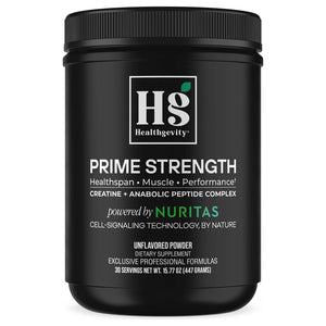 Through cutting edge Al-precision technology, Nuritas is creating a brand-new category of precision peptide ingredients from nature. Their cell-signaling power helps the body function at its best. Prime Strength is the third product resulting from Healthgevity's collaboration with Nuritas and contains PeptiStrong® : precision peptides that have been clinically proven to support muscle health. PeptiStrong® can increase muscle synthesis by supporting mTOR, reduce muscle loss by downregulating muscle atrophy related genes and improve muscle health by reducing inflammation properties.